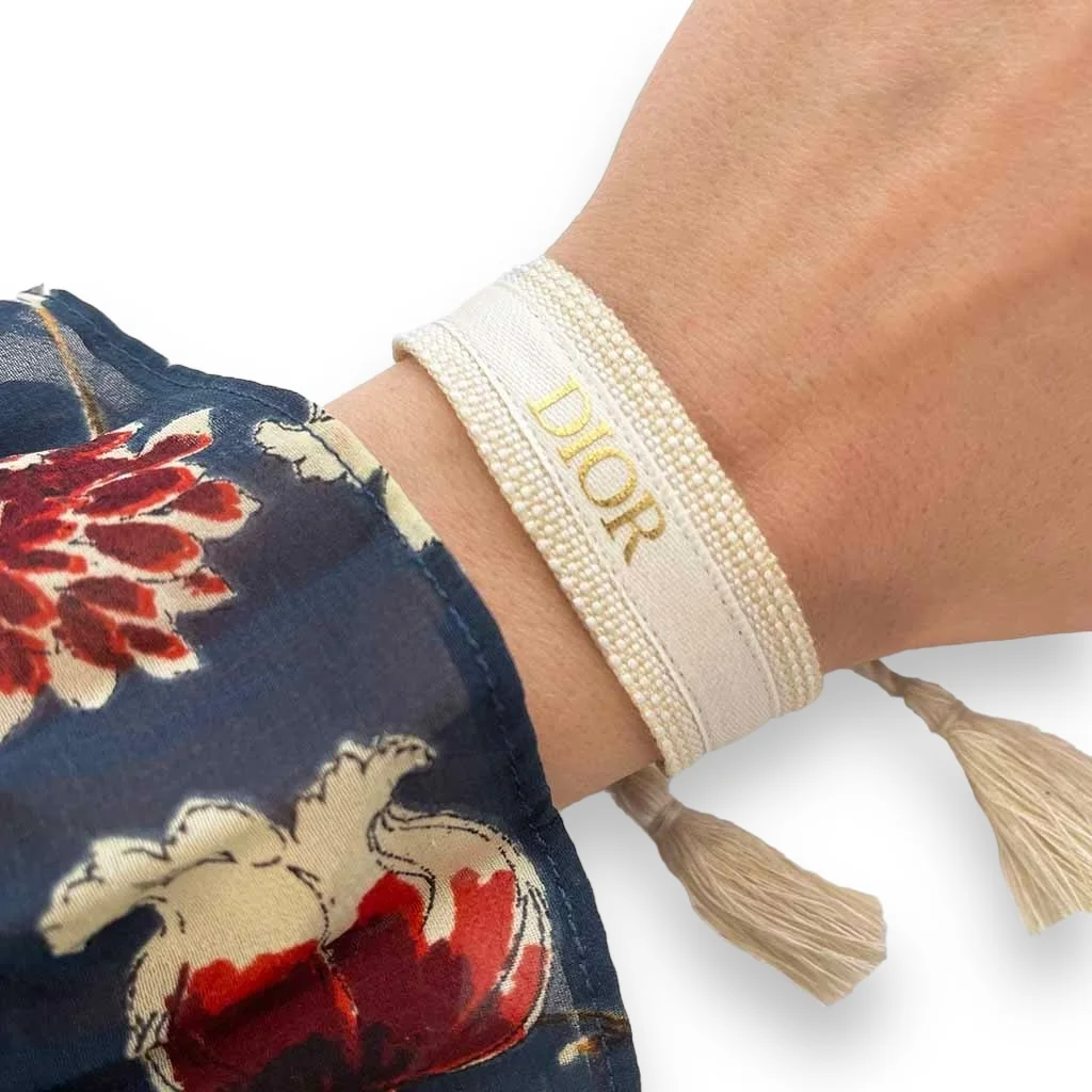 Coton – Polyester Beige – Blanc – Doré Ne pas porter sous l’eau Ajustable entre 16cm et 26cm / Largeur : 2cm