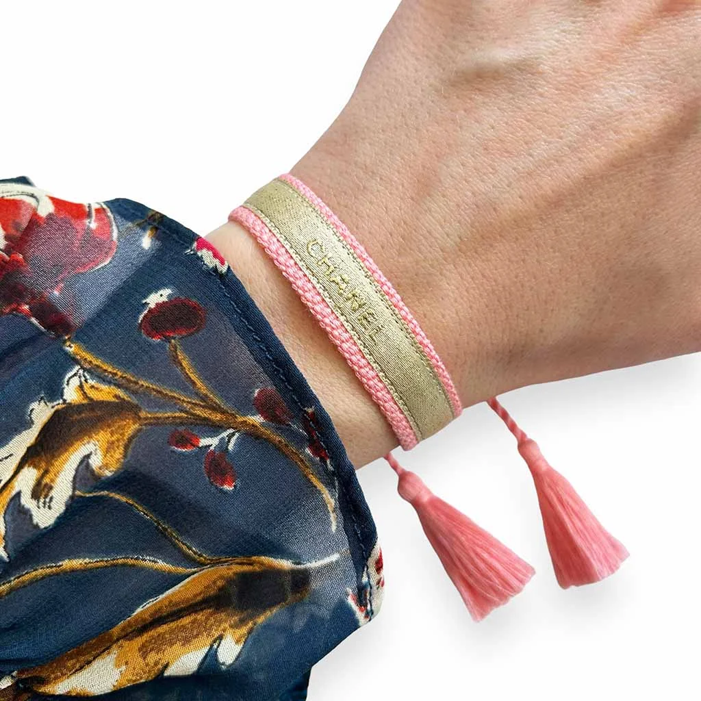 Coton – Polyester Rose – Doré Ne pas porter sous l’eau Ajustable entre 17cm et 25cm / Largeur 1,3cm