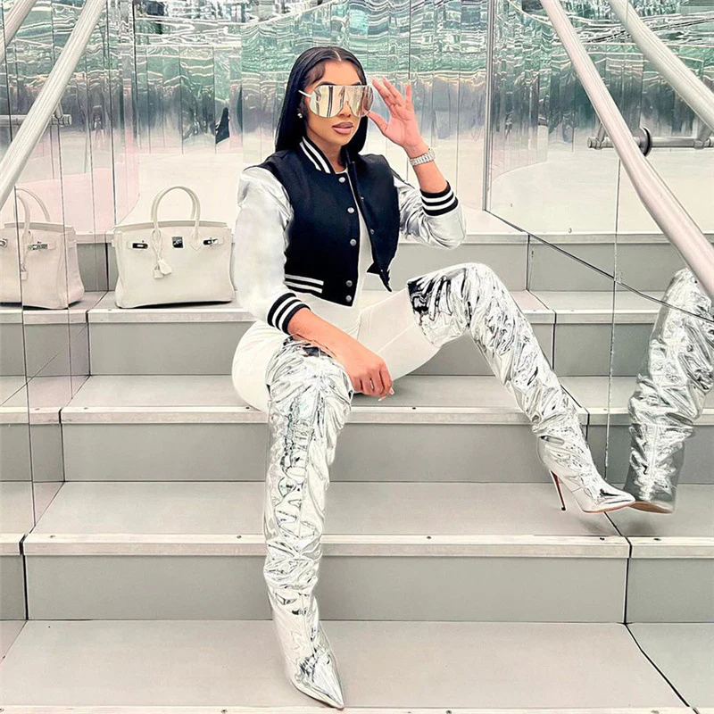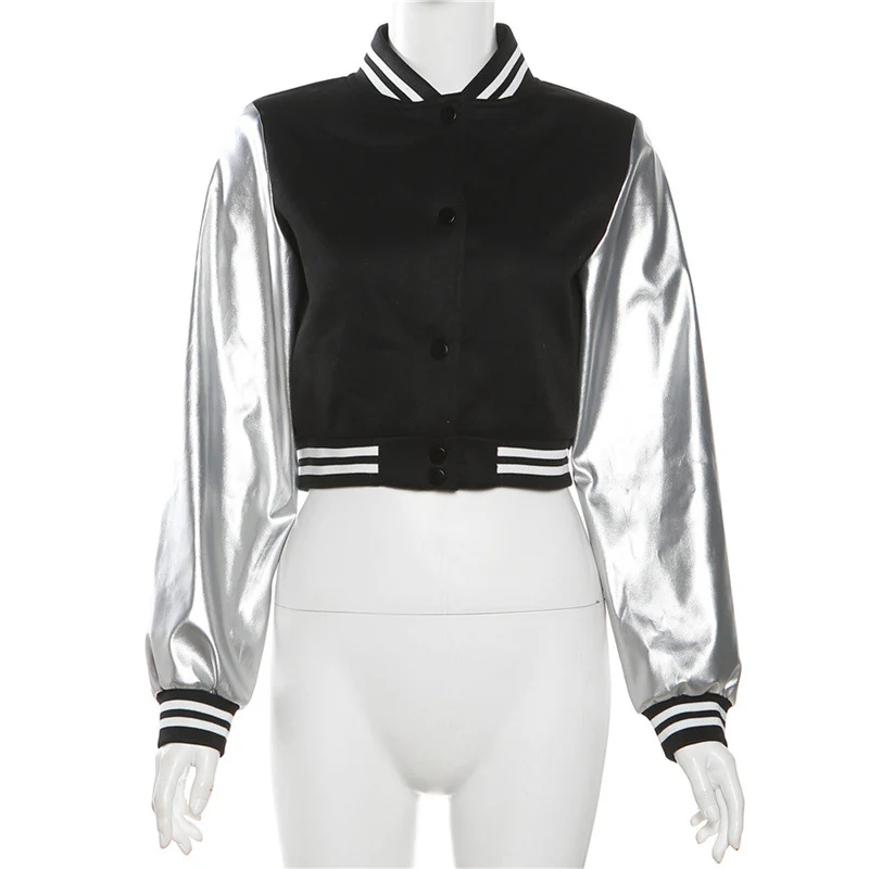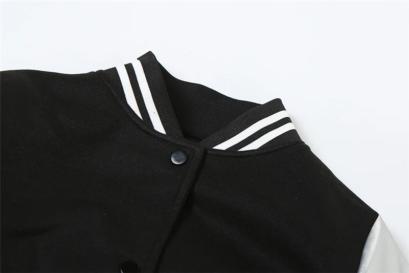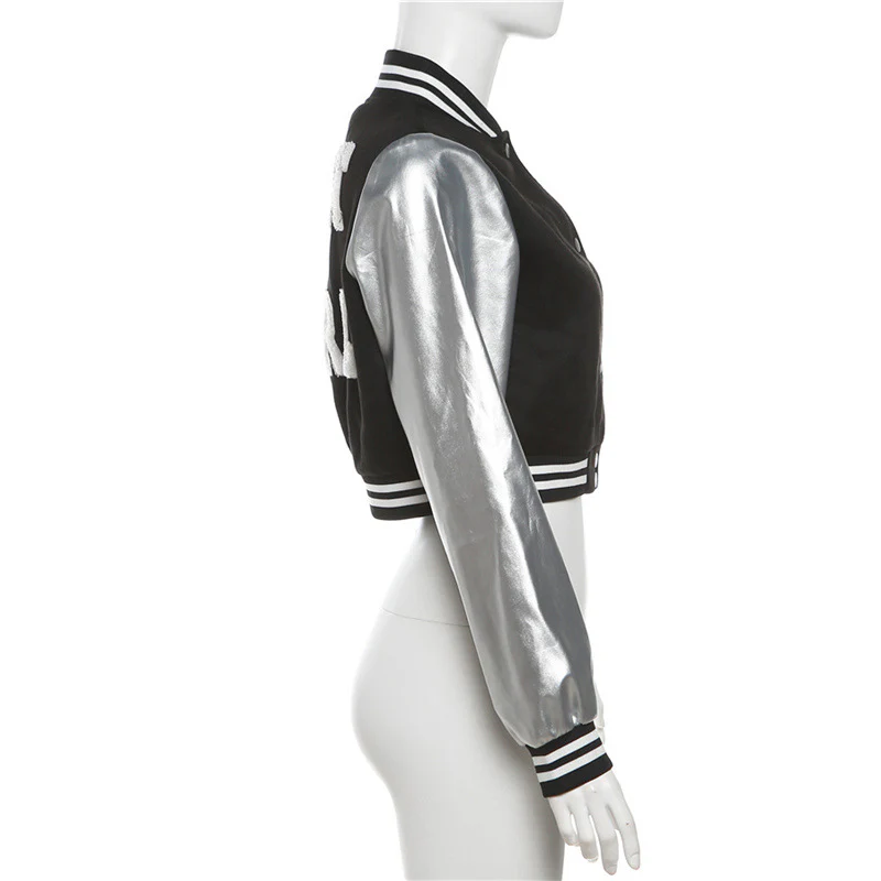 Les rues de Tokyo fusionnent avec l’esprit des campus américains dans ce blouson aux manches argentées scintillantes. Un corps noir audacieux rencontre des manches métalliques qui capturent la lumière à chaque mouvement. Les bandes rayées du col et des poignets rappellent l’héritage des équipes universitaires, tandis que la coupe courte ajoute une touche résolument urbaine.