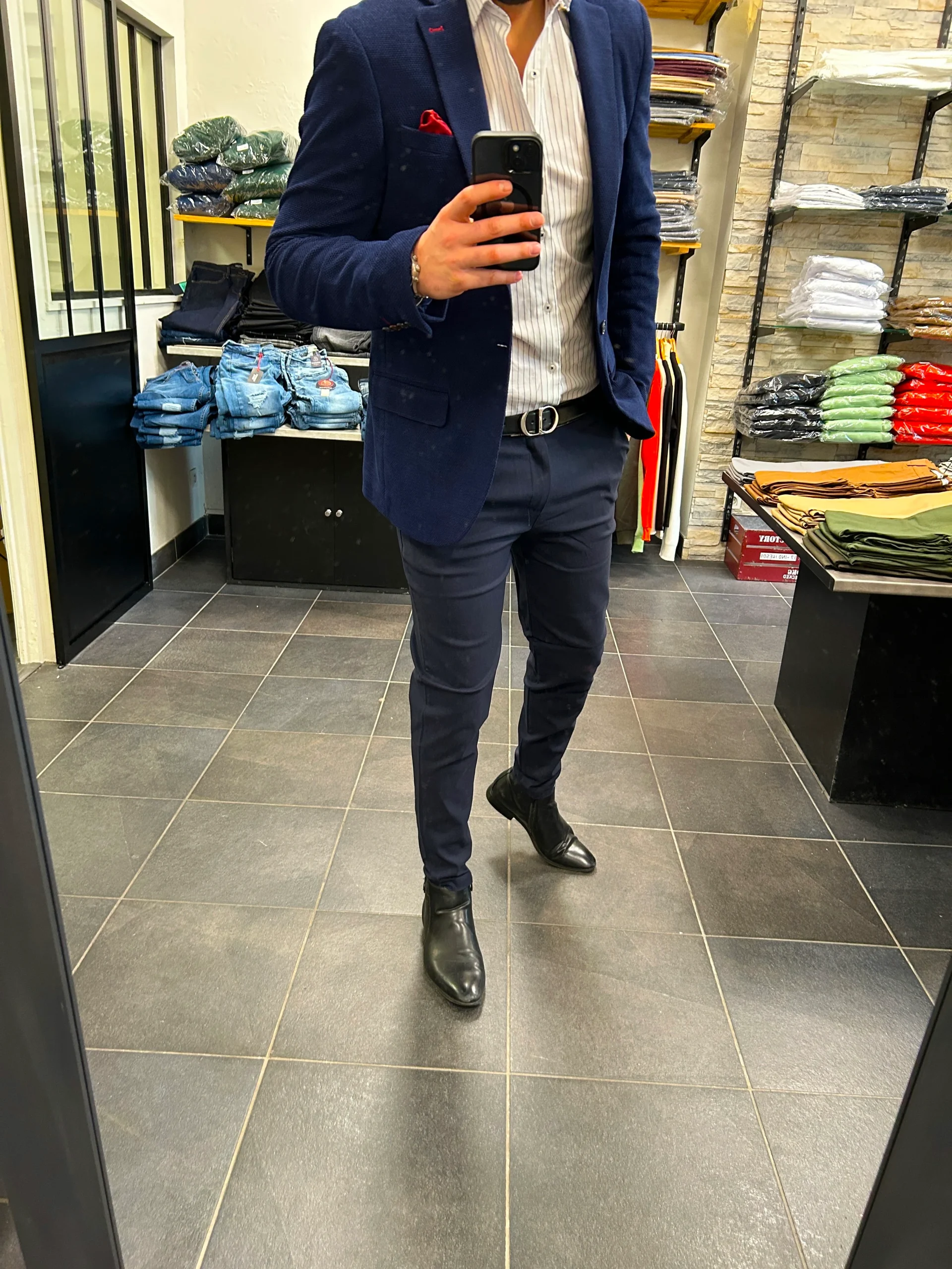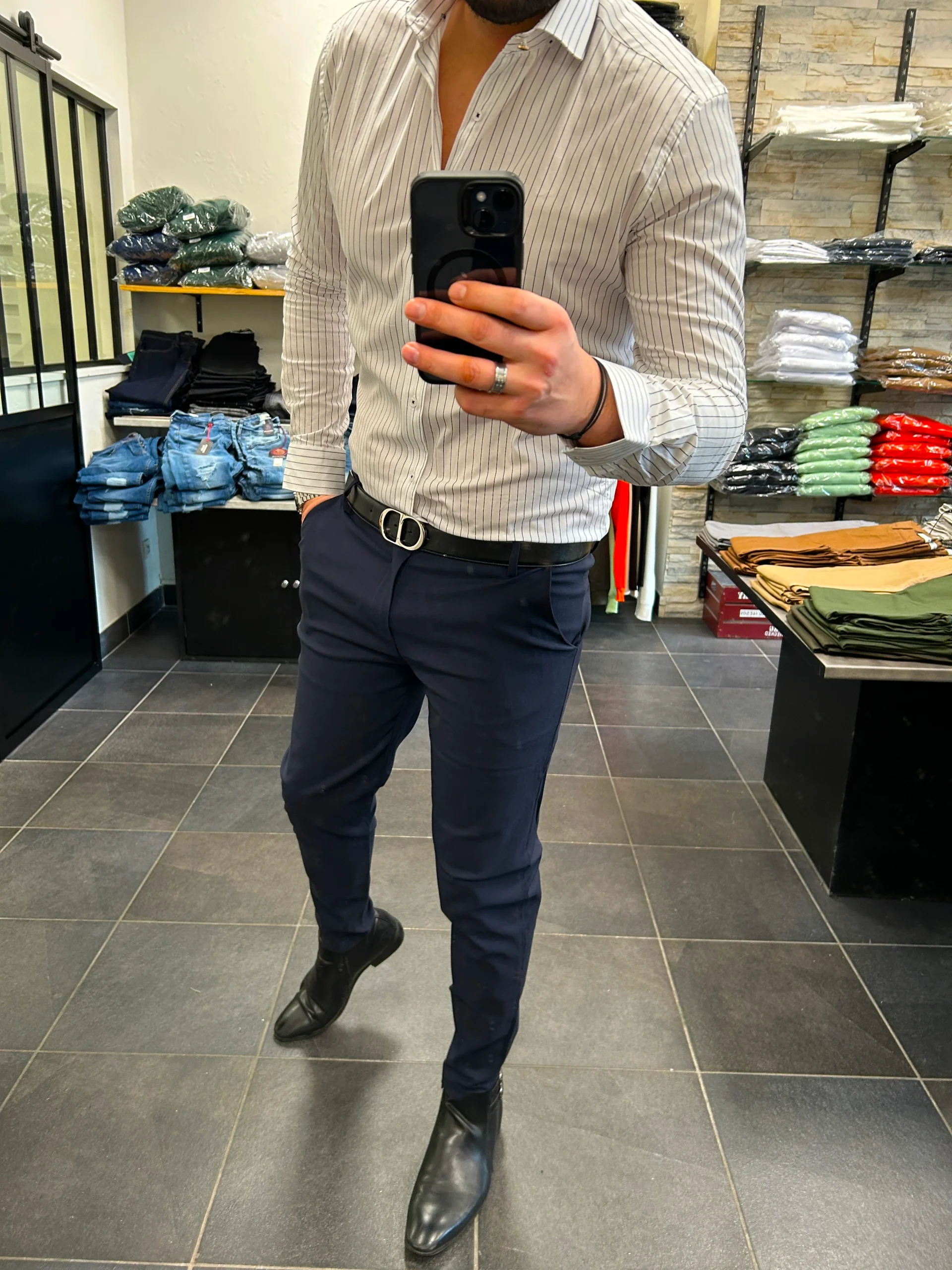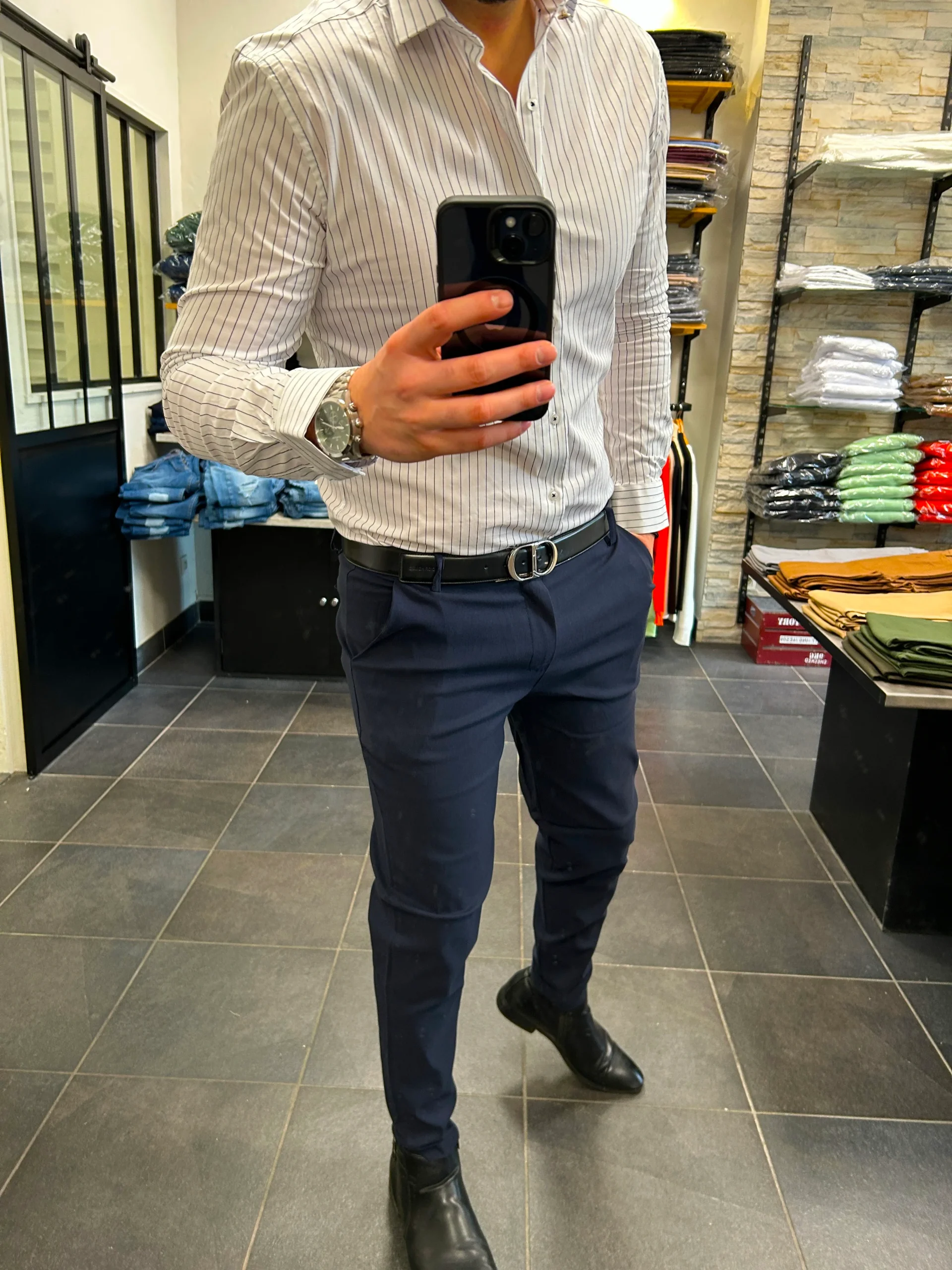 Chemise Blanche à rayure Marine – je fais 1M83 – je porte un L – Slim fit – bouton col or – 98% coton 2% elastahne Chemise Blanche à rayure Marine ideal pour ceux qui porte des chemises toute la journée confort et qualité prémium