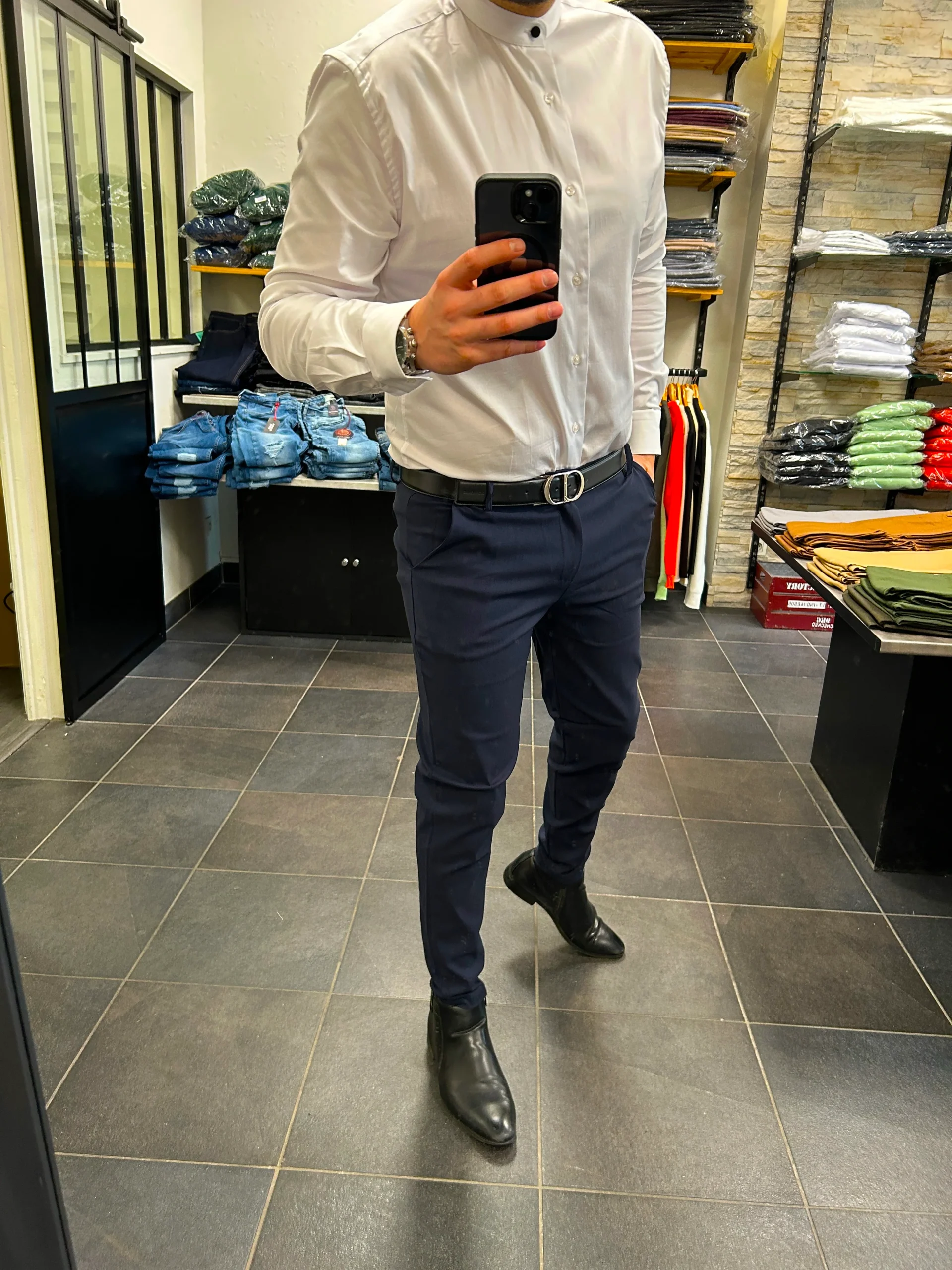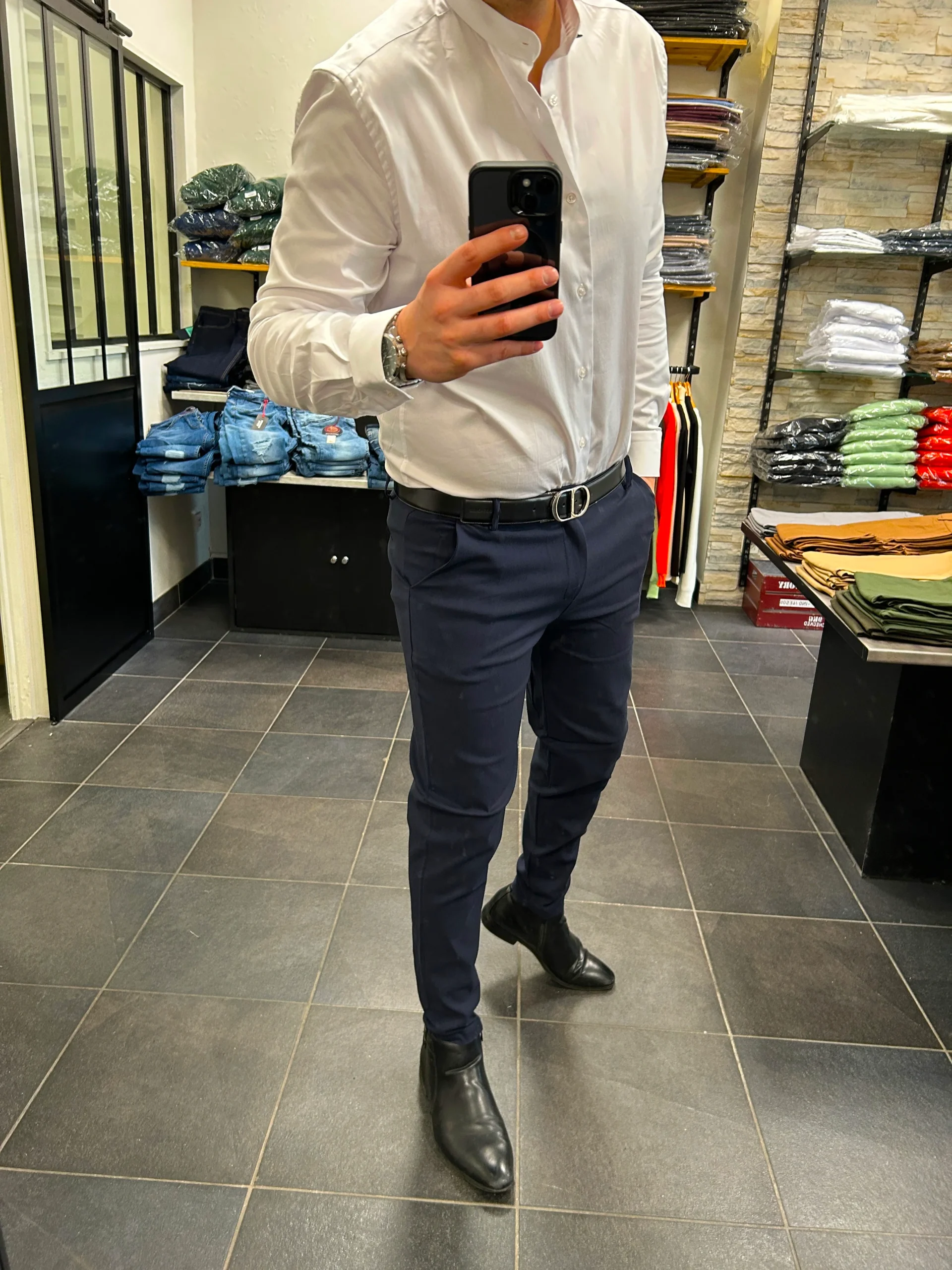 Chemise Col mao Blanc – je mesure 1M83 – je porte un L – composition: 98% coton 2% elasthane – Slim fit – du S au 3XL Chemise en col mao idéal a porter avec un jean ou un costume, qualité premium.