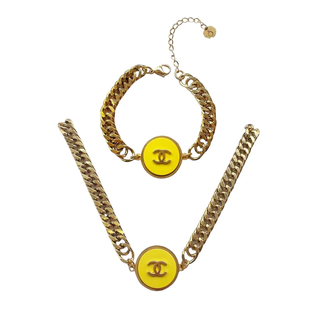 Informations Couleurs : Doré – Jaune Matières : Résine – Acier inoxydable – Métal Taille : Collier : 36cm + 5cm de rallonge / Bracelet : 13cm + 5cm de rallonge Photo retouchée Toutes nos créations proposées sur notre boutique en ligne sont réalisées à la main dans notre Atelier. Ainsi lorsque vous achetez sur notre site internet, vous achetez une création Second Souffle et non un produit de la marque dont la pièce upcyclée provient. Nous ne sommes pas affiliées à ces marques.