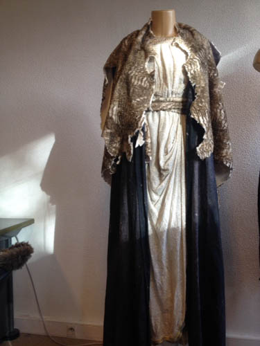 Ensemble de femme Viking à nombreux éléments dont peau de bête, en tissu divers, de couleur principale blanc cassé assortie de noir et marron – Costumes associés : Les ensembles MAGF2-14 à 25 sont assortis pour former un groupe de Vikings. Leurs pendants masculins existent. – Utilisable aussi pour un thème Barbares