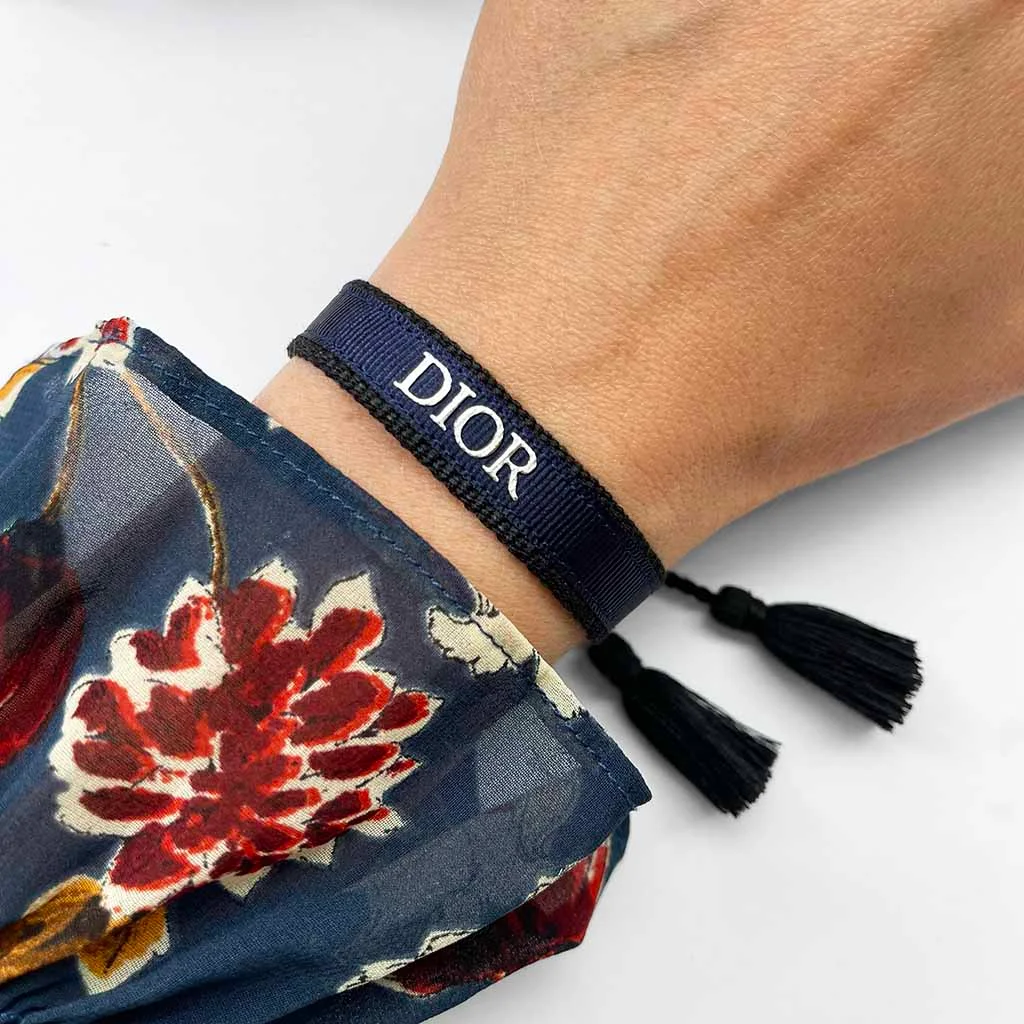 Coton – Polyester Noir – Bleu marine – Argenté Ne pas porter sous l’eau Ajustable entre 17cm et 25cm / Largeur 1,3cm