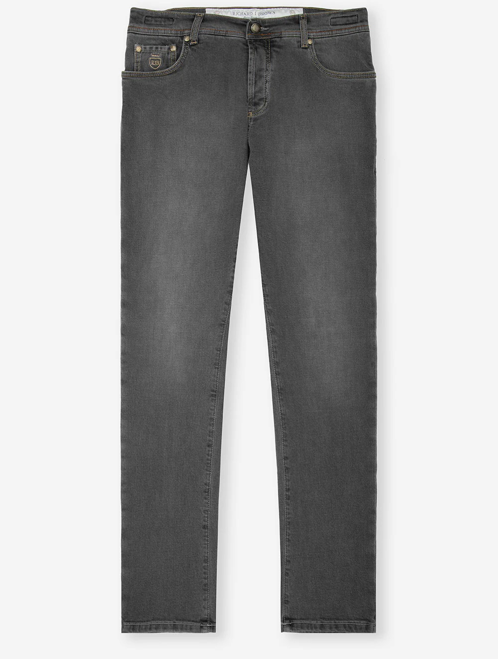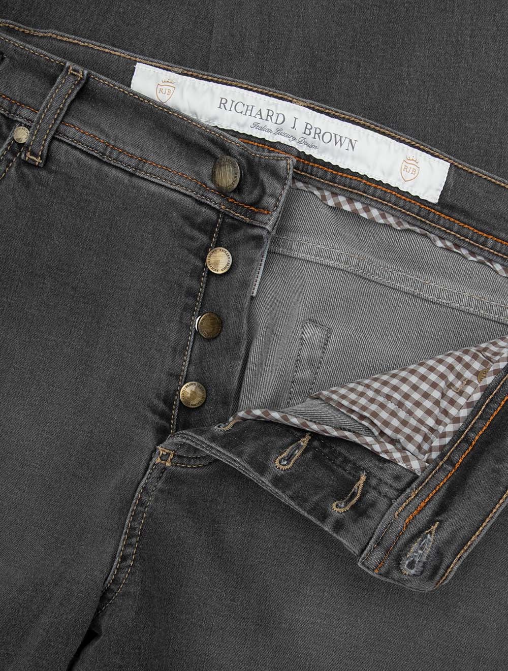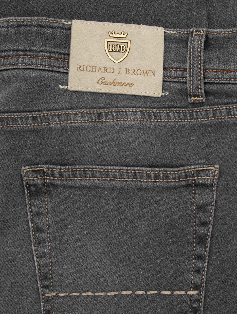The Richard J Brown Luxury Cashmere Jean in Grey blends exceptional Italian craftsmanship with timeless denim style. Since 2007, Richard J Brown has been creating premium jeans using the finest materials, and this pair is no exception. Crafted from a luxurious cotton-cashmere blend with a hint of stretch, they deliver unrivalled comfort, softness, and durability. The Milano fit offers a tailored yet versatile silhouette, while the classic five-pocket design, button-fly, and silver metal hardware add a refined edge. Finished with a stone suede brand patch for subtle distinction, these jeans are a true wardrobe investment. Style them casually with a T-shirt or polo, or dress them up with a crisp shirt, knitwear, or blazer for a polished smart-casual look.