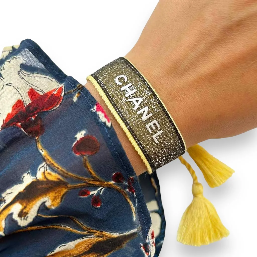 Coton – Polyester Jaune – Noir – Argenté Ne pas porter sous l’eau Ajustable entre 16cm et 26cm / Largeur : 2cm