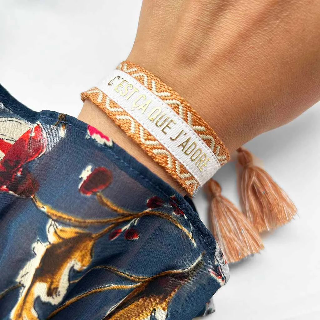 Coton Beige/Marron – Blanc – Doré Ne pas porter sous l’eau Ajustable entre 16cm et 26cm / Largeur : 2cm