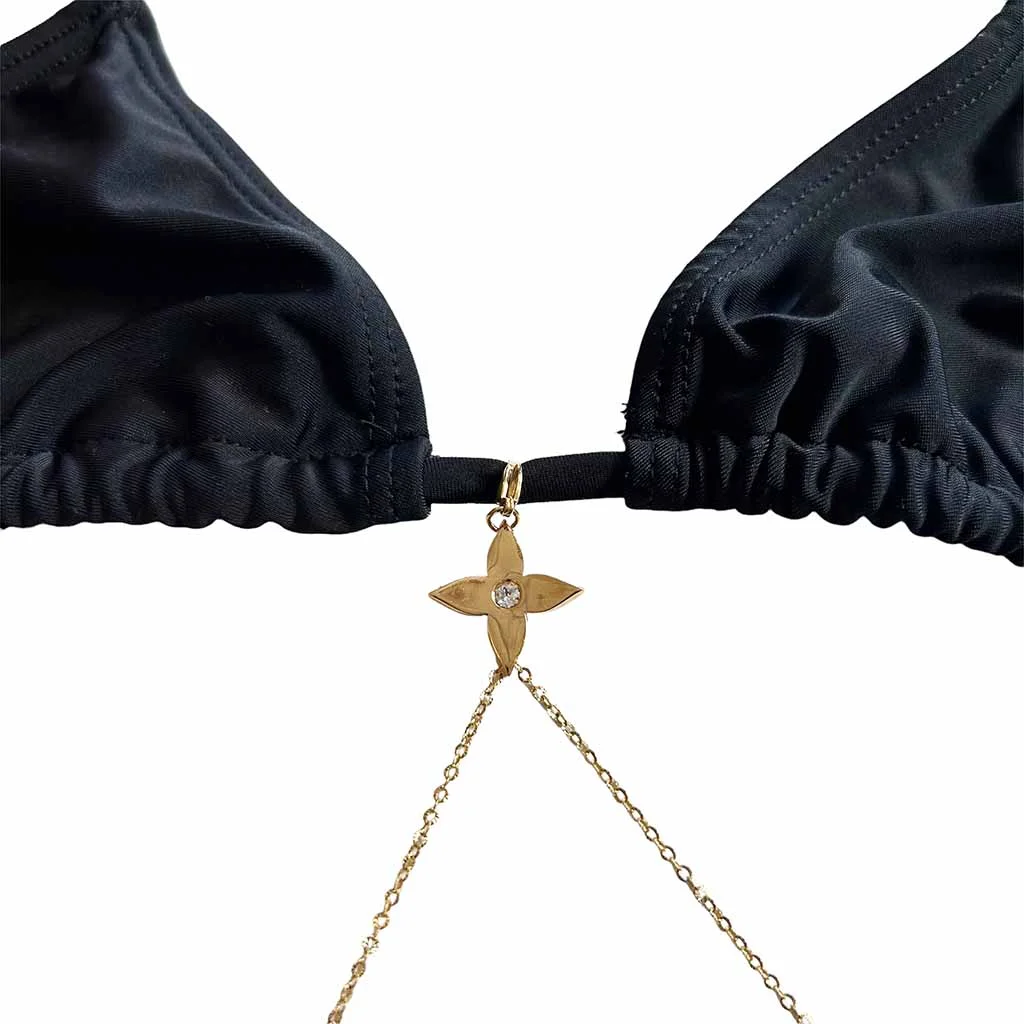Elasthanne Noir – Doré Taille 36 La chaîne de corps se détache pour être enlevée afin d’éviter le contact avec l’eau et/ou utilisée différemment