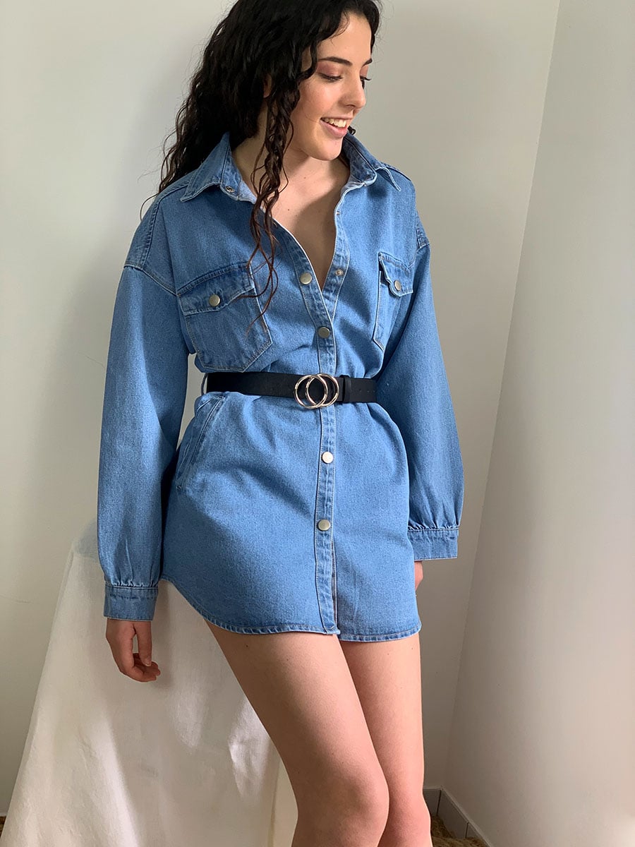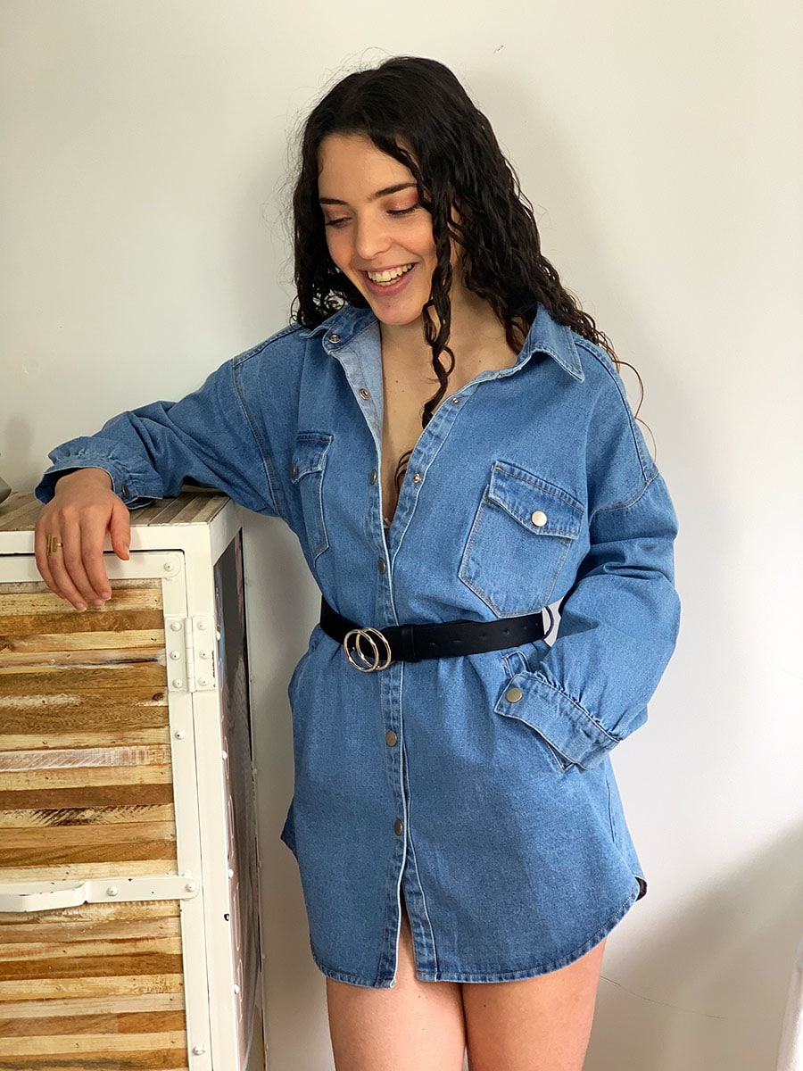 Veste type surchemise longue en jean Veste longue 100% coton. La veste Aline est entre la veste et la surchemise “oversized” en jeans. Manches longues Col anglais classique Fermeture pression métal Ceinture à nouer à la taille (avec passants) 4 poches
