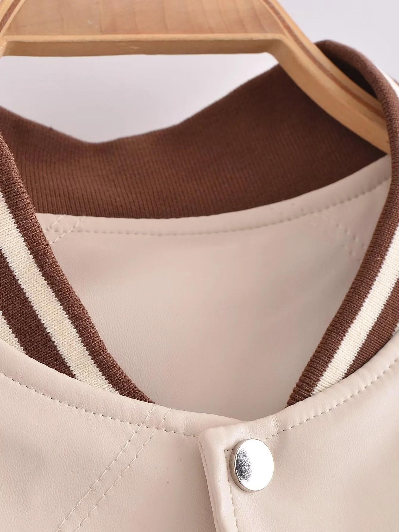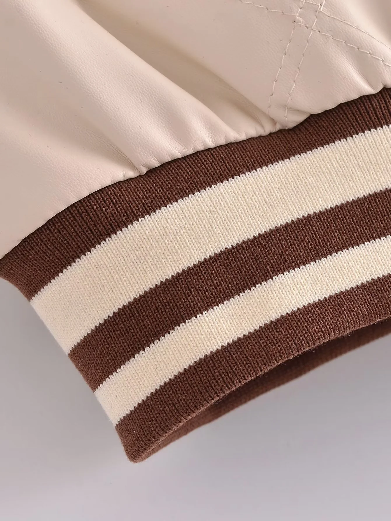 Les manches raglan chocolat contrastent avec le corps crème pour une silhouette qui respire le luxe décontracté californien. Les finitions sont impeccables : surpiqûres en losange, boutons-pression argentés, et bords-côtes tricolores qui signent son ADN sportif. La coupe courte moderne revisite les codes du vestiaire universitaire avec brio.